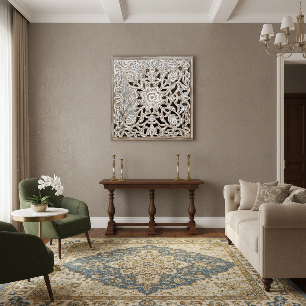 Luxury 48″x48″ Square Wall Decor with Mirror – Handcrafted Wooden Frame, Intricate Floral Carved Design, Oversized Statement Wall Art for Living Room, Bedroom & Entryway